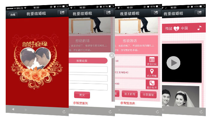 微喜帖是针对结婚庆典而推出的一款行业产品,主要是为计划结婚的用户们,通过使用微喜帖应用来向亲朋好友传播自己即将结婚的动态,可以展现用户想要表达的话、结婚日期、地址、导航、接待电话,同时亲朋好友可以在微喜帖平台上提交赴宴通知、送上祝福,并且转发喜帖。