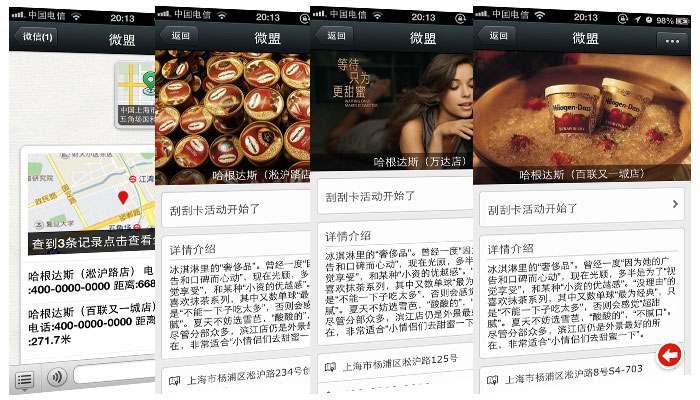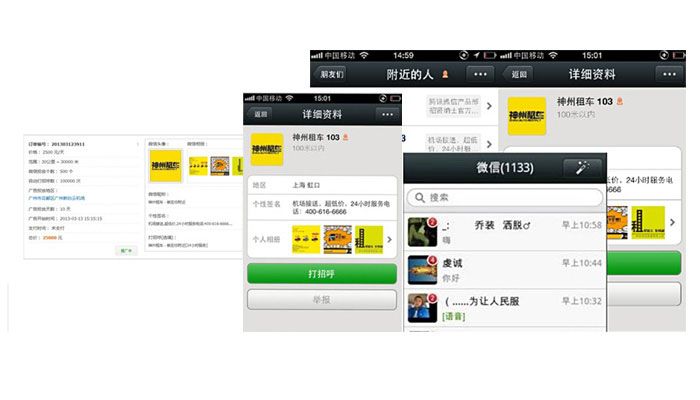 Location Surround Push(基于附近的人的消息推送)微信中基于LBS(基于位置的服务)的功能插件“查看附近的人”便可以使更多陌生人看到这种强制性广告。 用户点击“查看附近的人”后,可以根据自己的地理位置查找到周围的微信用户。在这些附近的微信用户中,除了显示用户姓名等基本信息外,还会显示用户签名档的内容。所以用户可以利用这个免费的广告位为自己的产品打广告。 营销人员在人流最旺盛的地方后台24小时运行微信,如果“查看附近的人”使用者足够多,这个广告效果也会不断随着微信用户数量的上升,可能这个简单的签名栏也会变成会移动的“黄金广告位”。