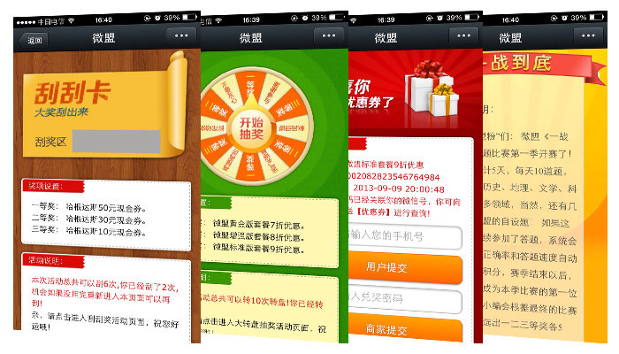 我们将利用微信的强交互性,让您通过对互动流程、环节和方式的设计,运用各种设计活动从而实现与用户的互动交流,,微整合系统互动符合微信娱乐性强的产品本质,云杉微营家内置了专为商家定制的“商家营销服务模块”,包括优惠券推广模块、幸运大转盘推广模块、刮刮卡抽奖模块、微投票、一战到底等功能模块,商家通过发起营销活动,对已有客户进行再营销,通过不断更新补充主题,用户可以反复参与,并可带动周边朋友一起分享,从而形成极强的口碑营销效果。